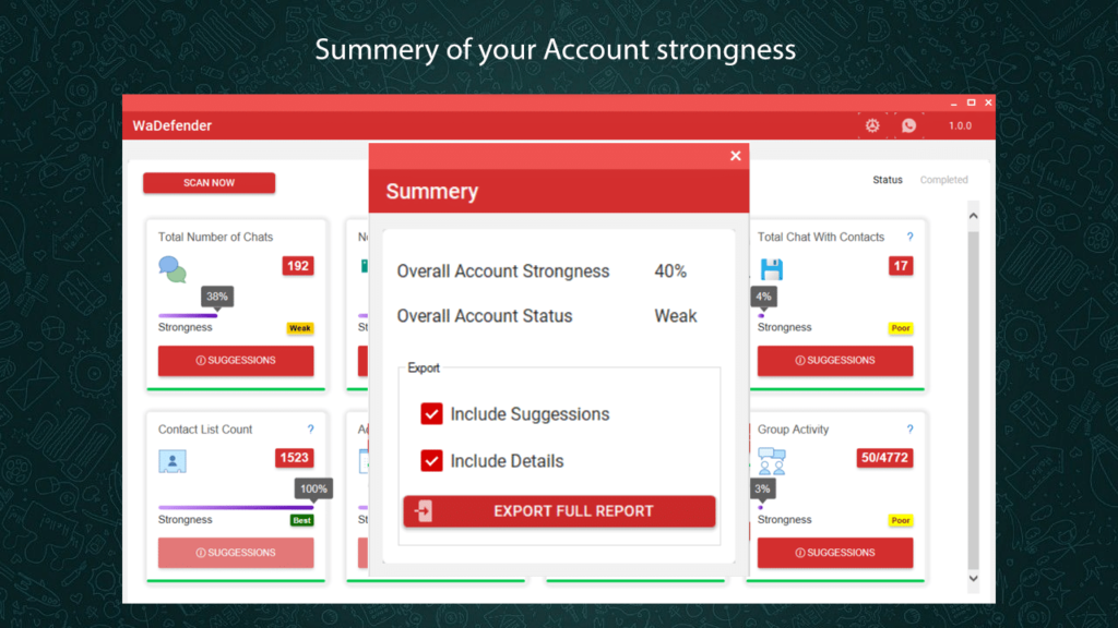 WaDefender considers factors like account age, activity level, and other parameters relevant to WhatsApp’s banning policies to determine account strength.
