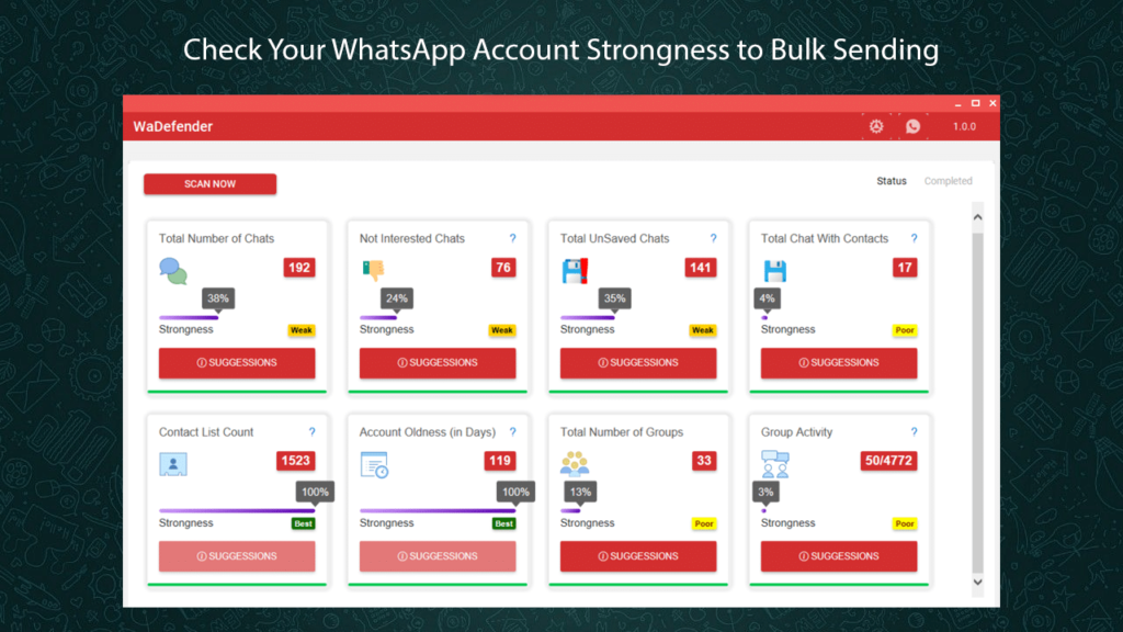 WaDefender is a Windows-based software designed to check the strength of WhatsApp accounts when sending messages in bulk.