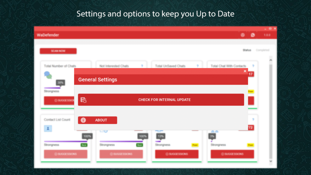 WaDefender features a modern Material Design user interface, the ability to export data to Excel sheets, detailed documentation with images and videos, runnable files, and a license key manager for activation.